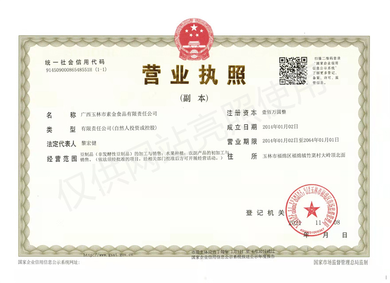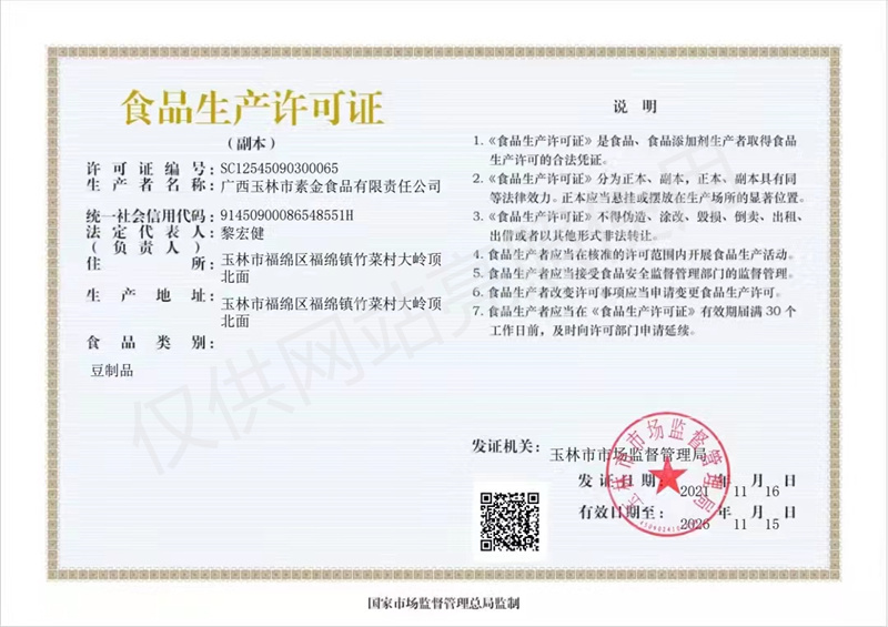 廣西玉林市素金食品有限責任公司品牌始創于2010年,品牌主導產品為“素金牌”黃豆腐竹、黑豆腐竹、花生腐竹等多種類腐竹。公司座落在20多畝果園式廠區的優美環境之中,擁有自主研發知識產權及5項發明專利先進的腐竹專業生產線,是一家機械化加工、無廢氣排放、水資源良性循環利用,具備研發、制造、生產豆類食品的專業加工企業。